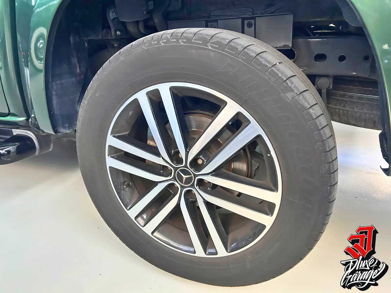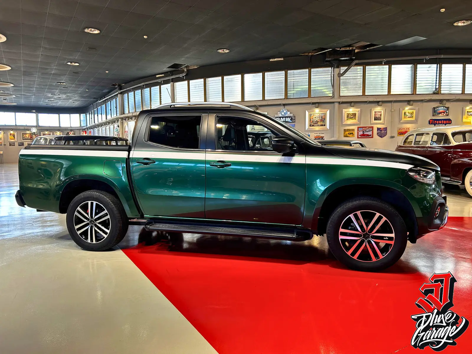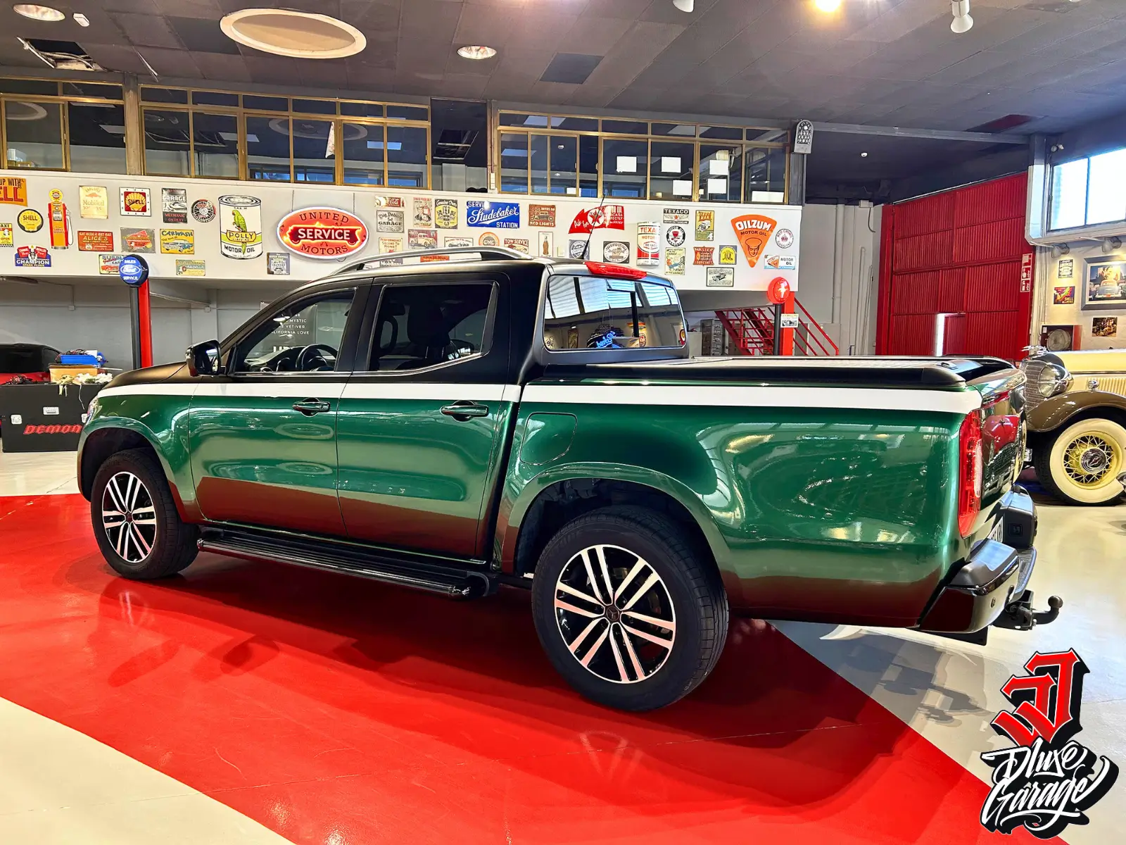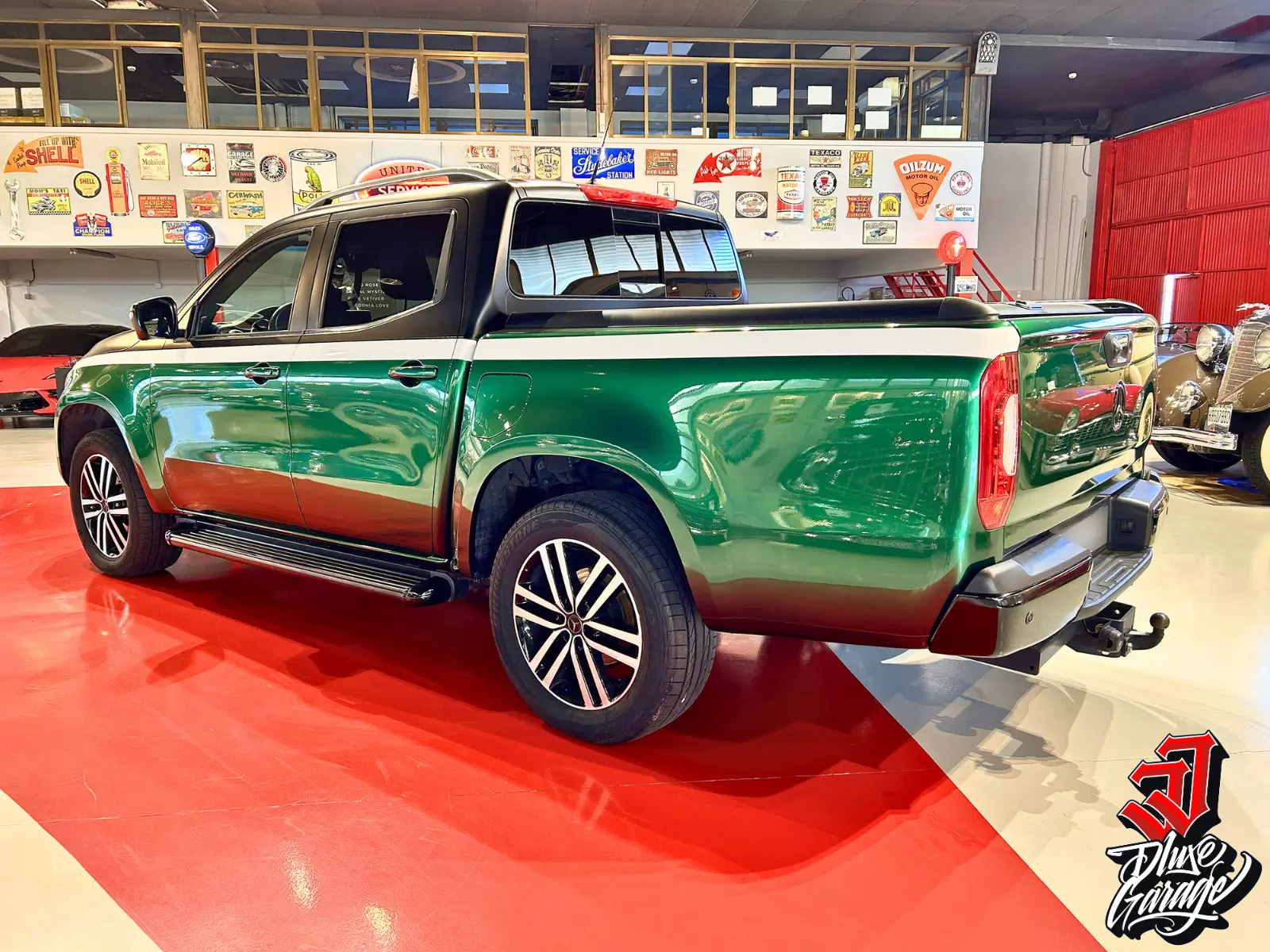 Diseño exclusivo: repintado en nuestro garaje hace tres años con acabado en tres tonalidades (superior negro mate, franja blanca y parte inferior verde). Presencia única frente a otras Mercedes X-Class en venta.